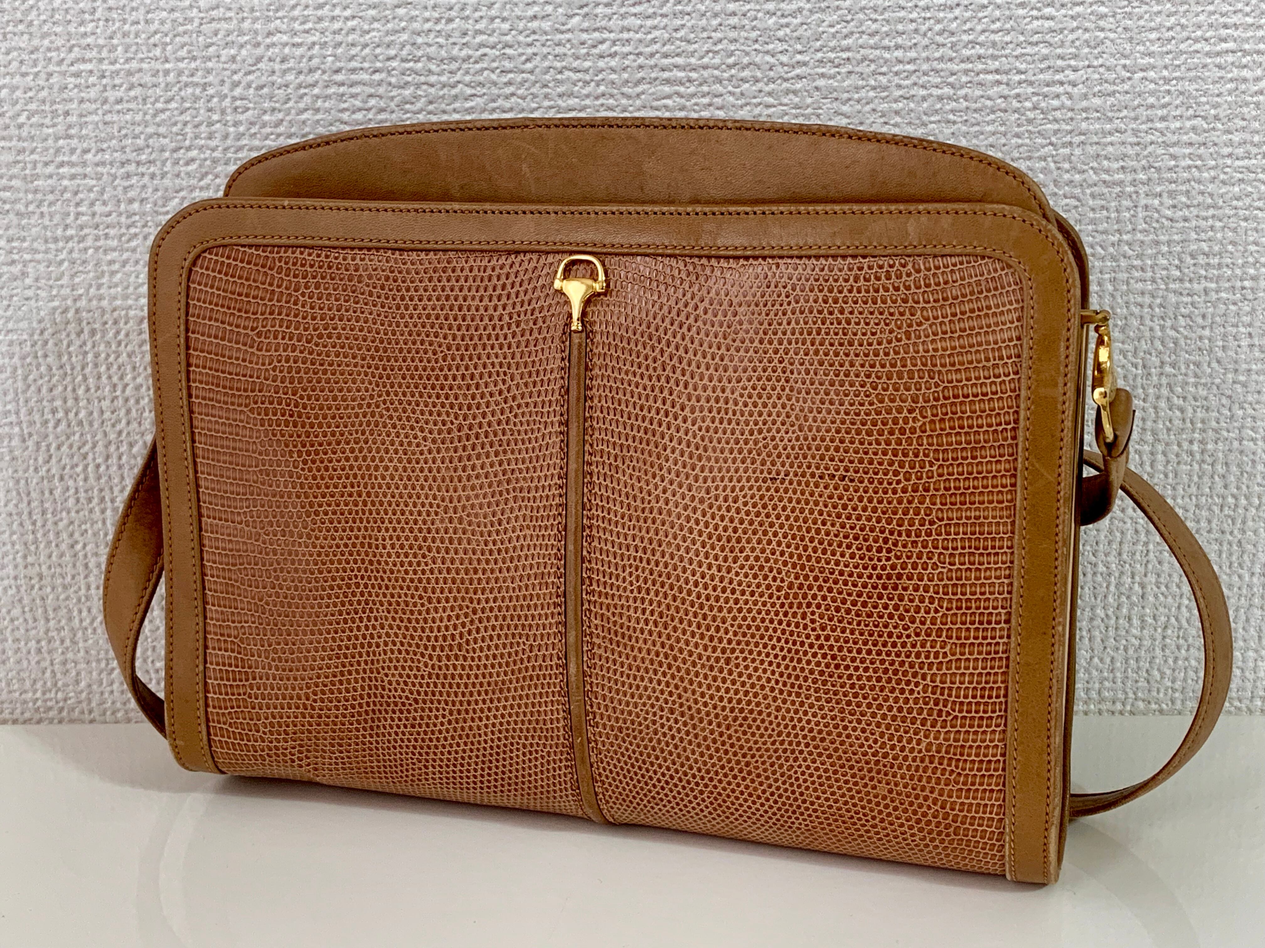 グッチ レザー リザード コンビ ショルダーバッグ ブラウン ヴィンテージ